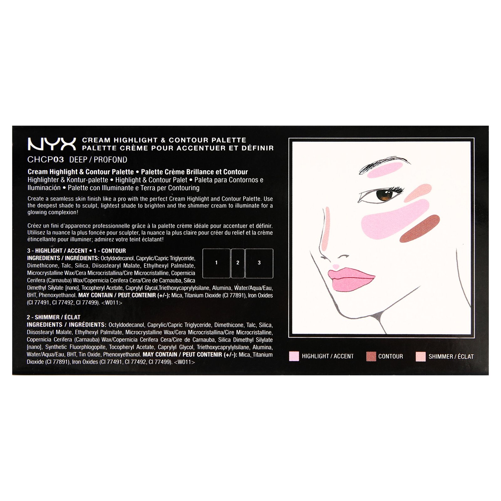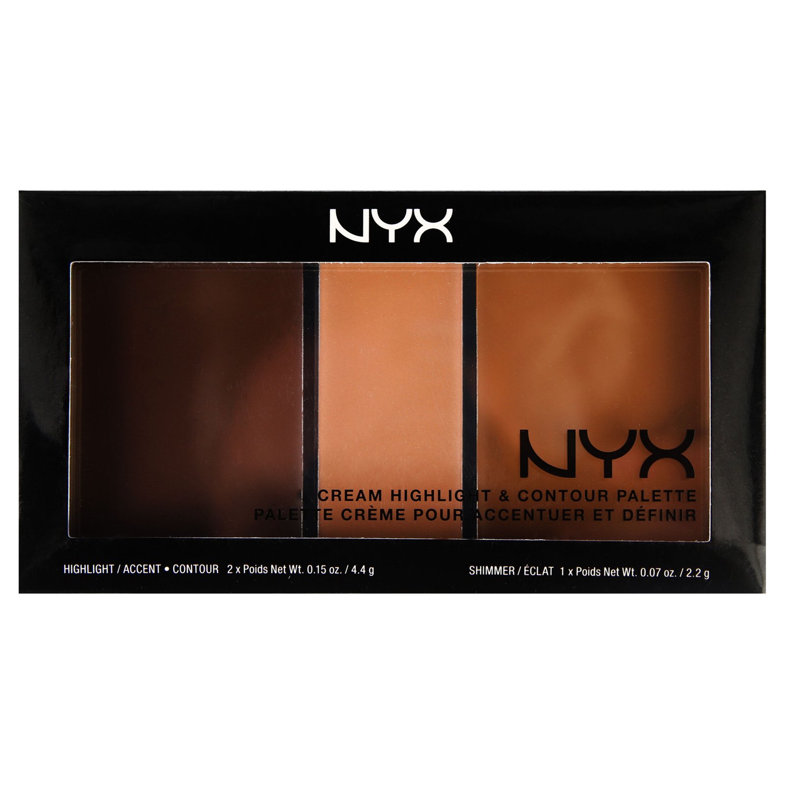 The NYX Professional Makeup cream highlight & contour palette contains three silky shades that work together to help you highlight, contour and illuminate your most beautiful natural features.