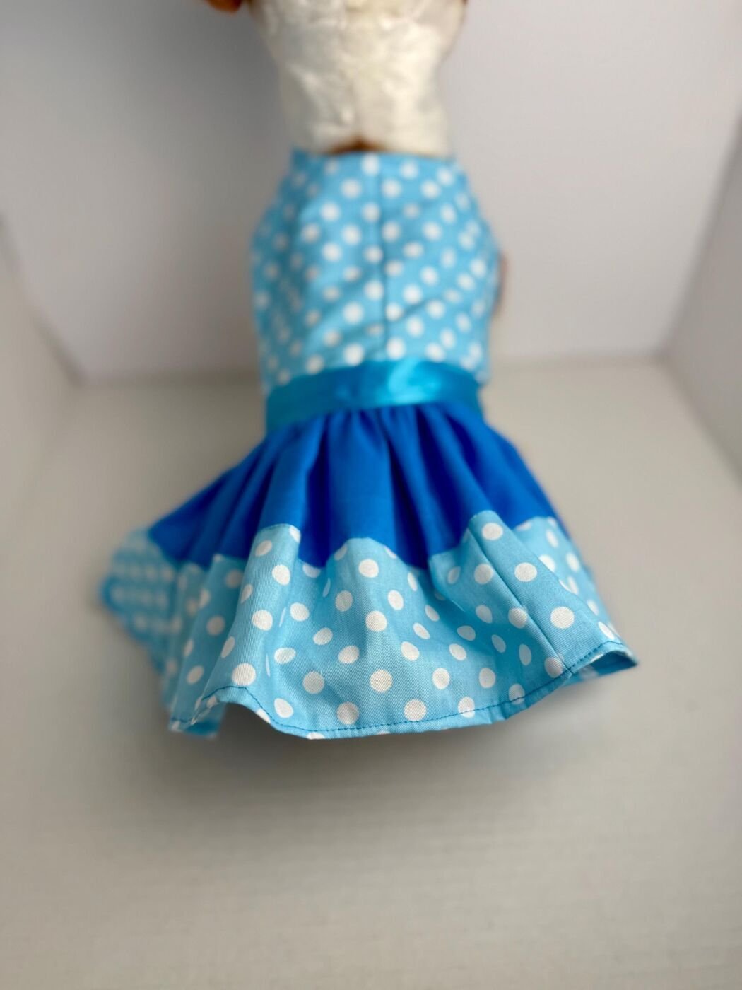 Handmade Cotton Dog Dress – Blue/Green Poka dot Puppy Outfit, Size Small