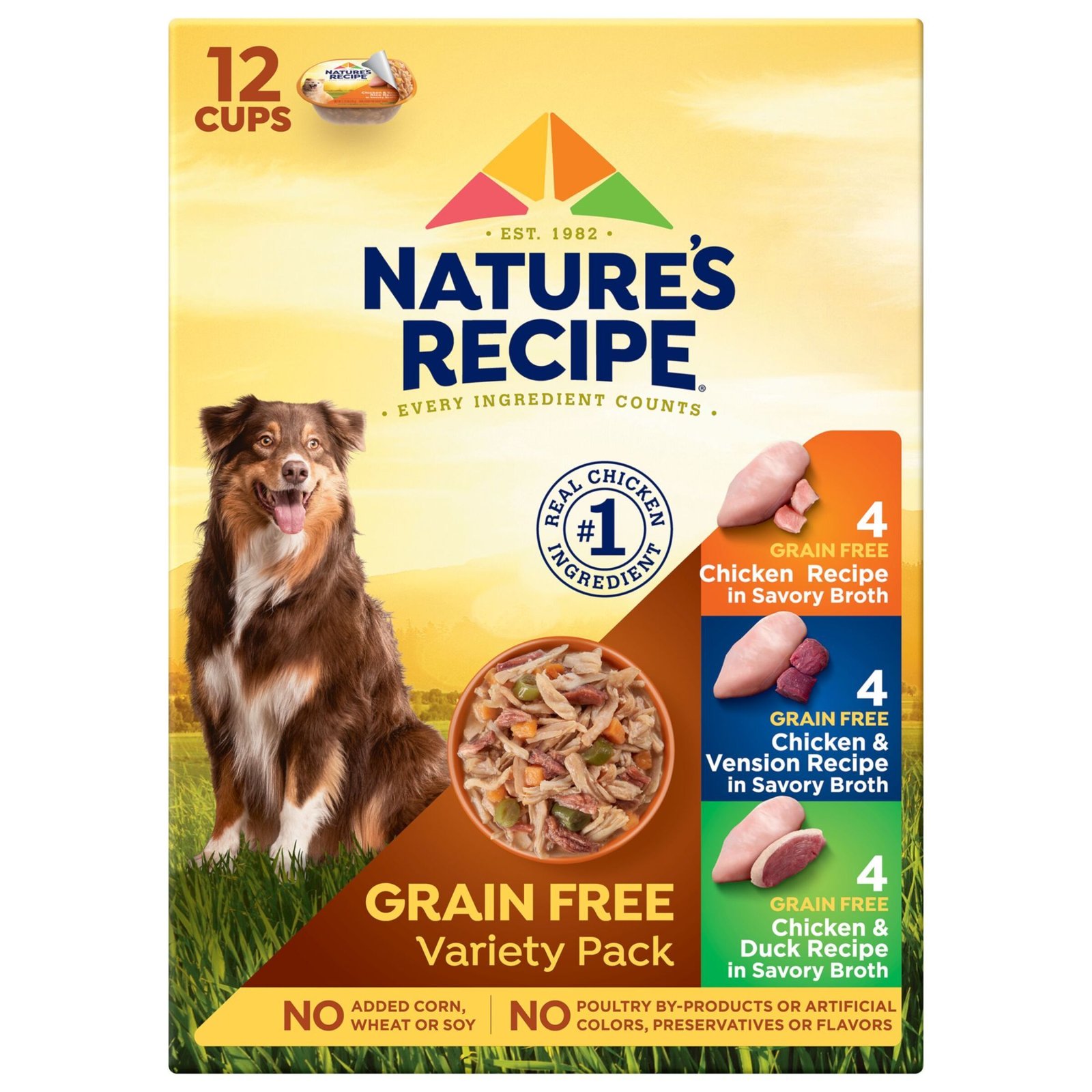 • Four (4) Grain Free Chicken Recipe in Savory Broth, four (4) Grain Free Chicken & Venison Recipe in Savory Broth and four (4) Grain Free Chicken & Duck Recipe in Savory Broth