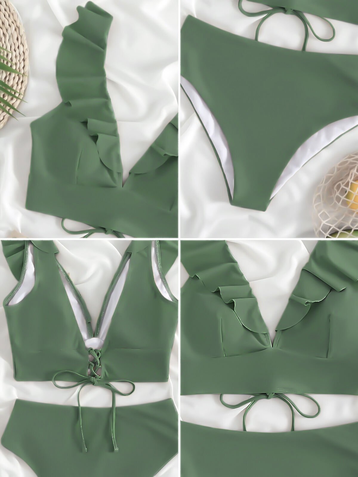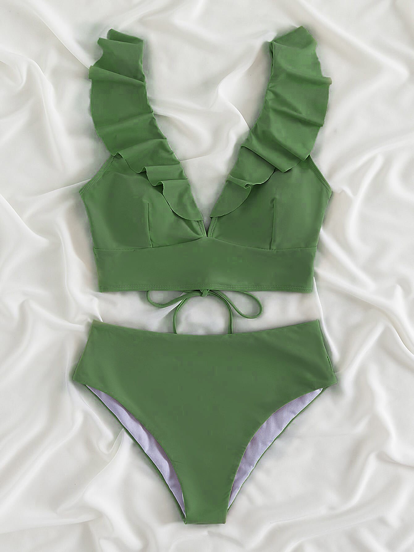 - Size: There’s 4 sizes are available. Please refer to the size chart as picture above. Color: Green Style: Cute Pattern Type: Plain Details: Ruffle, Lace Up Bottom Type: High Waist Bra Type: Wireless Bra Neckline: V neck Fabric Material: 80% Nylon, 20% Spandex
