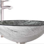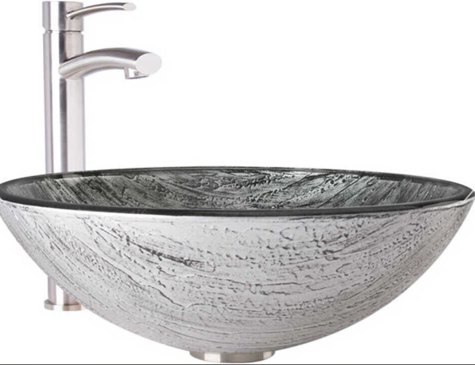 Swirls of silver and black come together beautifully in this Titanium Glass Vessel Sink set. Once you set up the Milo Faucet and pop-up in Brushed Nickel, your bathroom will instantaneously be transformed from drab to fab. The VG07050 Titanium Glass Vessel Sink features a shimmering mixture of black and silver tones.